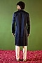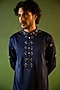 Featuring a midnight blue kurta in swiss silk base with mandarin collar, floral motif hand embroidery. It is paired with pants. Style with kolhapuri sandals for a festive, cultural occasion or intimate pooja ceremony, exuding traditional charm and elegance.