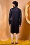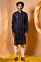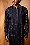 Featuring a midnight blue kurta in swiss silk base with mandarin collar, mirror work and hand embroidery. It is paired with pants. Style with kolhapuri sandals for a festive, cultural occasion, wedding or engagement ceremony, exuding traditional charm and elegance.