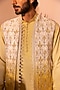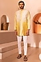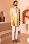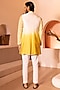 Featuring an ombre yellow shrug in padma silk base with beads, cutdana and thread hand embroidery. It is paired with a matching kurta and pants.