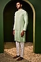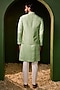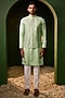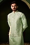 Featuring a pastel green waistcoat in dupion silk base with mandarin collar, mirror work and hand embroidery. It is paired with a kurta and pants. Style with mojaris for a festive occasion, summer wedding, mehendi, sangeet or engagement ceremony, exuding traditional charm and elegance.