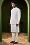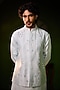Featuring a powder blue waistcoat in dupion silk base with mandarin collar, threadwork and hand embroidery. It is paired with a kurta and pants. Style with mojaris for a festive occasion, wedding, sangeet or engagement ceremony, exuding traditional charm and elegance.