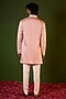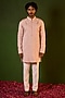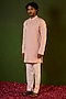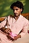 Featuring a powder pink kurta in swiss silk base with mandarin collar and floral jaal embroidery. It is paired with pants. Style with kolhapuri sandals for a festive, cultural occasion or intimate pooja ceremony, exuding traditional charm and elegance.