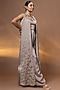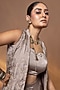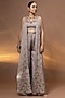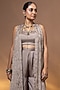 Featuring a mauve long jacket in habutai silk base with mirror embroidery. It is paired with a bustier and pants. Accentuate it with zircon jewellery and block heels for a wedding or sangeet ceremony.