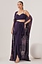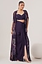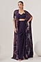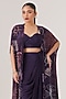 Featuring a purple cape in natural crepe base with abstract print and cutdana embellishments. It is paired with a pleated bralette and a draped skirt. Accentuate it with dangler earrings and heels for a cocktail look.