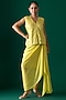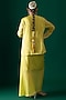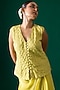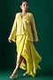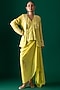 Featuring a yellow jacket in habutai silk base with mirror embroidery. It is paired with a vest and a draped skirt. Accentuate it with polki jewellery and block heels for a wedding or haldi ceremony.