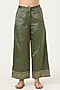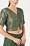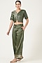 Featuring an emerald green half and half crop top in pure silk base with shoulder padding and button closure. It is paired with matching wide-legged pants.