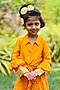 Featuring a yellow ruffled shirt for girls in crepe silk, cotton and kota base. It is paired with a bandhej skirt. Style it with cute hair accessories and sandals for birthday parties or evening gatherings.