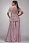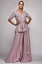 Featuring a lilac peplum top in silk base with pearl tassels, upcycled sequins, pearls, gold zari, and cutdana embroidery. It is paired with matching sharara pants and a star net dupatta.