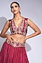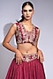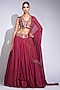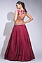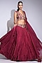 Featuring a maroon lehenga in pure silk base with upcycled sequins embroidery and a hand-beaded tasseled belt. It is paired with a silk blouse having gold zari and dori embroidery, including a georgette dupatta. Accentuate it with statement earrings and block heels for weddings or sangeet ceremonies.