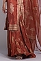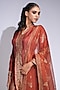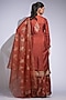 Featuring an orange and gold kurta in silk base with hand block print. It is paired with modal satin hand block printed sharara pants and an organza dupatta. Accentuate it with statement earrings and block heels for weddings or sangeet ceremonies.