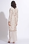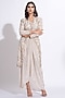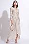 Featuring a taupe jacket in silk base with sequins and zari embroidery. It is paired with a crepe dhoti skirt. Accentuate it with statement earrings and heels for festive celebrations family gatherings.
