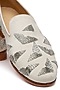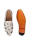 Featuring a pair of white slip-on shoes in velvet base with silver hand embroidery. It has a leather underlining, a leather cushioned footbed and 1 inch heels. Perfect wear for a festive occasions or wedding ceremonies.