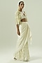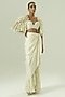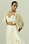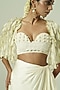 Featuring an ivory and olive green cape in satin georgette, organza and crepe base. It is paired with a bustier and a skirt. Accentuate it with statement jewellery, a clutch and block heels for an evening look.