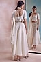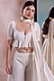Featuring an ivory peplum top in organic cotton base with hanging beads and ruffles. It is paired with flared pants and a patchwork dupatta. Accentuate it with statement jewellery and heels for weddings or festive occasions.