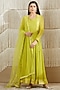 Featuring an akira green anarkali in chanderi brocade and georgette base with anchor and thread embroidery. It is paired with matching rayon twill pants and a net dupatta.