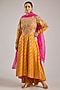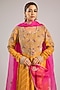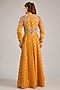 Featuring an apricot yellow anarkali in banarasi brocade base with zardosi embroidery. It is paired with churidar and an organza dupatta. Accentuate it with kundan polki jewellery and block heels for festive occasion or haldi ceremony.