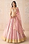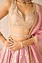 Featuring a blush pink lehenga in tissue organza brocade base with zardosi embroidery. It is paired with an embroidered blouse, a belt and an organza dupatta. Style with delicate chandbalis and soft glam makeup for a romantic feel, perfect for intimate ceremonies or pre-wedding events.