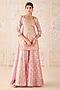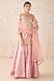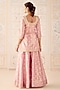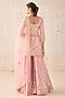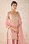 Featuring a blush pink kurta in tissue organza brocade base with zardosi embroidery. It is paired with sharara pants and an organza dupatta. Style with delicate chandbalis and soft glam makeup for a romantic feel, perfect for intimate ceremonies or pre-wedding events.