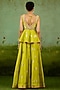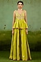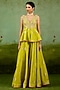 Featuring a bright green kurta in silk brocade base with zardosi hand embroidery. It is paired with sharara pants. Style it with statement earrings, soft curls and block heels, perfect for festive gatherings or mehendi ceremony.