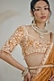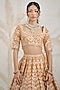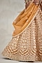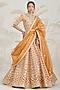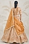Featuring a burnt orange lehenga in silk tissue organza base with gota embroidery. It is paired with a blouse, belt and a dupatta. Accentuate it with gold or polki jewellery, an embroidered potli bag and heels for a wedding or engagement ceremony.