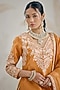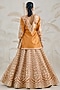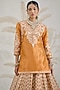 Featuring a burnt orange lehenga in silk tissue organza base with gota embroidery. It is paired with a short kurta and a dupatta. Accentuate it with gold or polki jewellery, an embroidered potli bag and heels for a reception, sangeet, wedding or engagement ceremony.