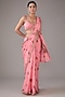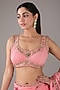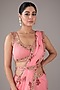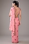 Featuring a candy pink saree in organza base with hand-block print and zardosi embroidery. It is paired with a blouse and a belt. Accentuate with statement jewellery and heels for a wedding or sangeet ceremony.