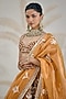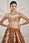 Featuring a coffee brown-burnt orange lehenga in silk tissue organza base with gota embroidery. It is paired with a blouse and a dupatta. Accentuate it with gold or polki jewellery and heels for a sangeet, wedding or engagement ceremony.