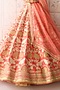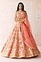 Featuring a coral orange lehenga in raw silk base with applique embroidery. It is paired with a blouse, an organza dupatta and a belt. Accentuate the designer lehenga with polki jewellery, block heels and a potli bag for a wedding, sangeet or engagement ceremony.