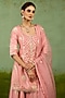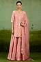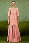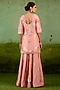 Featuring a coral pink kurta in silk brocade base with gota and thread embroidery. It is paired with sharara pants and an organza dupatta. Style it with statement earrings, soft curls and block heels, perfect for festive gatherings or sangeet ceremony.