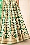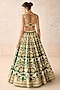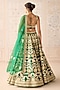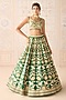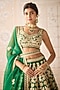Featuring a dark green lehenga in raw silk base with applique embroidery. It is paired with a blouse, an organza dupatta and a belt. Accentuate the designer lehenga with polki jewellery, block heels and a potli bag for a wedding, mehendi or engagement ceremony.