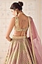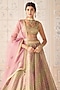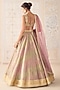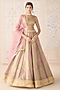 Featuring a dusty rose pink lehenga in tissue organza brocade base with zardosi embroidery. It is paired with an embroidered blouse, a belt and an organza dupatta. Style with delicate chandbalis and soft glam makeup for a romantic feel, perfect for intimate ceremonies or pre-wedding events.