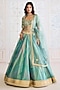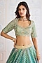 Featuring a dusty turquoise green lehenga in tissue organza brocade base with zardosi embroidery. It is paired with an embroidered blouse, a belt and an organza dupatta. Style with delicate chandbalis and soft glam makeup for a romantic feel, perfect for intimate ceremonies or pre-wedding events.