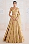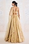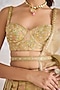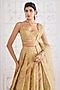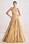 Featuring a gold pleated lehenga in tissue brocade base with zardosi embroidery. It is paired with an embroidered blouse, a belt and an organza dupatta. Style with delicate chandbalis and soft glam makeup for a romantic feel, perfect for intimate ceremonies or pre-wedding events.