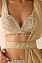 Featuring a gold lehenga in tissue organza brocade base with zardosi embroidery. It is paired with an embroidered blouse, a belt and an organza dupatta. Style with delicate chandbalis and soft glam makeup for a romantic feel, perfect for intimate ceremonies or pre-wedding events.