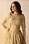 Featuring a gold lehenga in tissue organza brocade base with zardosi embroidery. It is paired with an embroidered blouse, a belt and an organza dupatta. Style with delicate chandbalis and soft glam makeup for a romantic feel, perfect for intimate ceremonies or pre-wedding events.