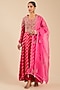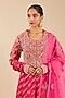 Featuring a hibiscus pink anarkali in banarasi brocade base with zardosi hand embroidery. It is paired with trousers and an organza dupatta. Accentuate it with kundan polki jewellery and block heels for festive occasion or sangeet ceremony.