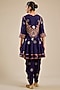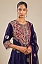 Featuring a midnight blue kurta in silk brocade and organza base. It is paired with dhoti and a dupatta. Style it with statement earrings and heels for a festive occasion, sangeet ceremony or family get-together.