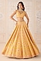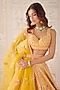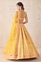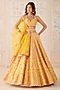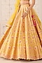 Featuring a mustard yellow lehenga in raw silk base with gota and thread embroidery. It is paired with a blouse, a net dupatta and a belt. Accentuate the designer lehenga with polki jewellery, block heels and a potli bag for a wedding, haldi or engagement ceremony.