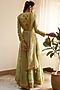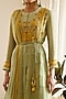 Featuring a neutral green anarkali in modal satin and flat chiffon base with applique and thread embroidery. It is paired with matching rayon twill pants and a dupatta.