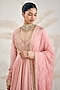 Featuring an old rose pink anarkali in banarasi georgette base with zardosi embroidery. It is paired with pants and an organza dupatta. Style with statement kundan or polki jewelry, a sleek bun, and dewy makeup for wedding and sangeet ceremonies.