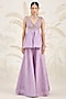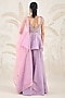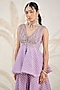 Featuring an orchid lavender top in banarasi brocade georgette base with zardosi embroidery. It is paired with sharara and an organza dupatta. Style with statement kundan or polki jewelry, a sleek bun, and dewy makeup for wedding and sangeet ceremonies.