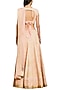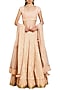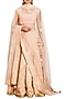 Featuring a peach lehenga skirt in raw silk base with gold applique and fine thread work embroidery. It is paired with a matching cap sleeve blouse with open back and sheer dupatta.