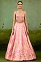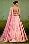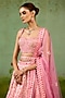 Featuring a pink lehenga in raw silk base with applique, gota and thread embroidery. It is paired with a blouse, a belt and an organza dupatta. Style it with pearl earrings, a bun and block heels, perfect for a wedding, engagement or sangeet ceremony.
