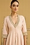 Featuring a powder pink kurta in banarasi brocade, organza and silk brocade base with zardosi embroidery. It is paired with pants. Accentuate it with pearl or zircon jewellery and heels for a pre-wedding ceremony.