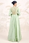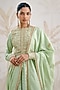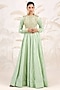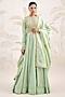 Featuring a sea green anarkali in chanderi brocade base with zardosi embroidery. It is paired with pants and a chanderi dupatta. Style with statement kundan or polki jewelry, a sleek bun, and dewy makeup for wedding and sangeet ceremonies.