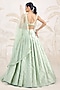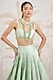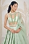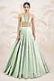 Featuring a seacrest green pleated lehenga in banarasi silk brocade base. It is paired with a blouse and a silk organza zardosi embroidered dupatta. Accentuate it with choker necklace set and heels for a reception, sangeet, wedding or engagement ceremony.