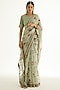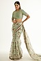 Featuring a smoke green saree in silk organza base with zardosi embroidery and hand block print. It is paired with a blouse having pintucks. Accessorize it with heels and statement earrings for weddings, mehendi ceremonies or festive occasions.