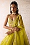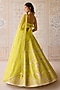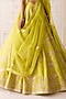 Featuring a spring green lehenga in raw silk base with applique and thread embroidery. It is paired with a blouse, an organza dupatta and a belt. Accentuate the designer lehenga with polki jewellery, block heels and a potli bag for a wedding, mehendi or engagement ceremony.