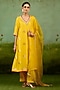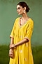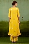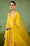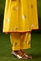 Featuring a vibrant yellow A-line kurta in silk brocade base with zardosi hand embroidery. It is paired with trousers and an organza dupatta. Style it with statement earrings, soft curls and block heels, perfect for festive gatherings or haldi ceremony.