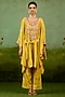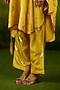 Featuring a yellow kaftan in silk brocade base with gota and thread embroidery. It is paired with trousers and a belt. Style it with statement earrings, soft curls and block heels, perfect for festive gatherings or haldi ceremony.
